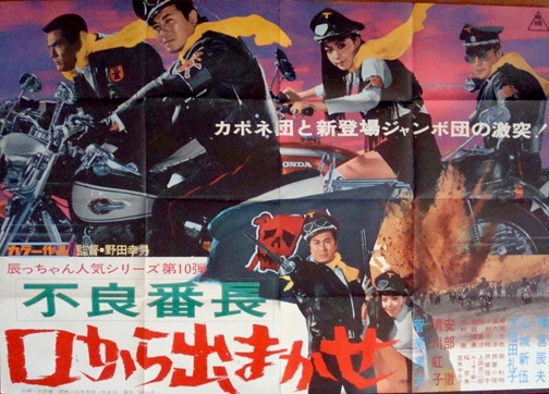 Rare large 2 panel poster of the 10th episode of the Japanese produced Yakuza / bikers Furyo Bancho series starring Tatsuo Umemiya, Bunta Sugawara and Reiko Oshida Motor Psycho! (Eve Productions, 1965) One Sheet