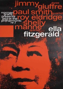 This Oscar Peterson Trio – 1965 German Tour poster was released in 1965 and features a collage of portraits of Oscar Peterson, Ray Brown and Ed Thigpen. Designed by Gunther Kieser for the trio’s 1965 German concert tour.Keiser used photographs as the basis for his designs but incorporated graphic elements over them to create memorable images which mystified the jazz great he was designing for.This very large and rarer concert poster designed by Gunther Kieser in collaboration with Hans Michel for the Jazz At The Philarmonic 1960 German tour featuring Ella Fitzgerald, Jimmy Giuffre and Roy Eldridge.