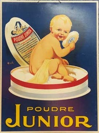 | Additional Information: | Original. Cartone. Great bathroom image with this baby sitting in the powder box. This ad is selling babypowder of course! The image itself has a cobalt backing with a slight varnish gloss. Minor scratches in the background. Unretouched original condition. This is an Original Lithograph Vintage Poster; it is not a reproduction. This poster is professional acid-free conservation mounted, linen backed, and in very good condition. |